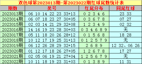 发布日期:2023-03-02 04:33 点击次数:163上期开奖:双色球第2023022期开出奖号为:10 11 18 19 23 31+03,红球余数散布为0 1 3 8 9,包含同尾红球:11 31。