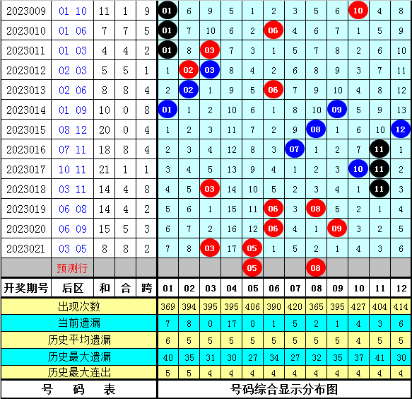 后区上期开出奖号:03+05,前6次后区奖号03+05出现之后,其下期诀别开出号码:01+06、04+05、07+10、03+07、03+11、04+05,本期后区把稳五码02 05 08 10,单挑两码05 08。
